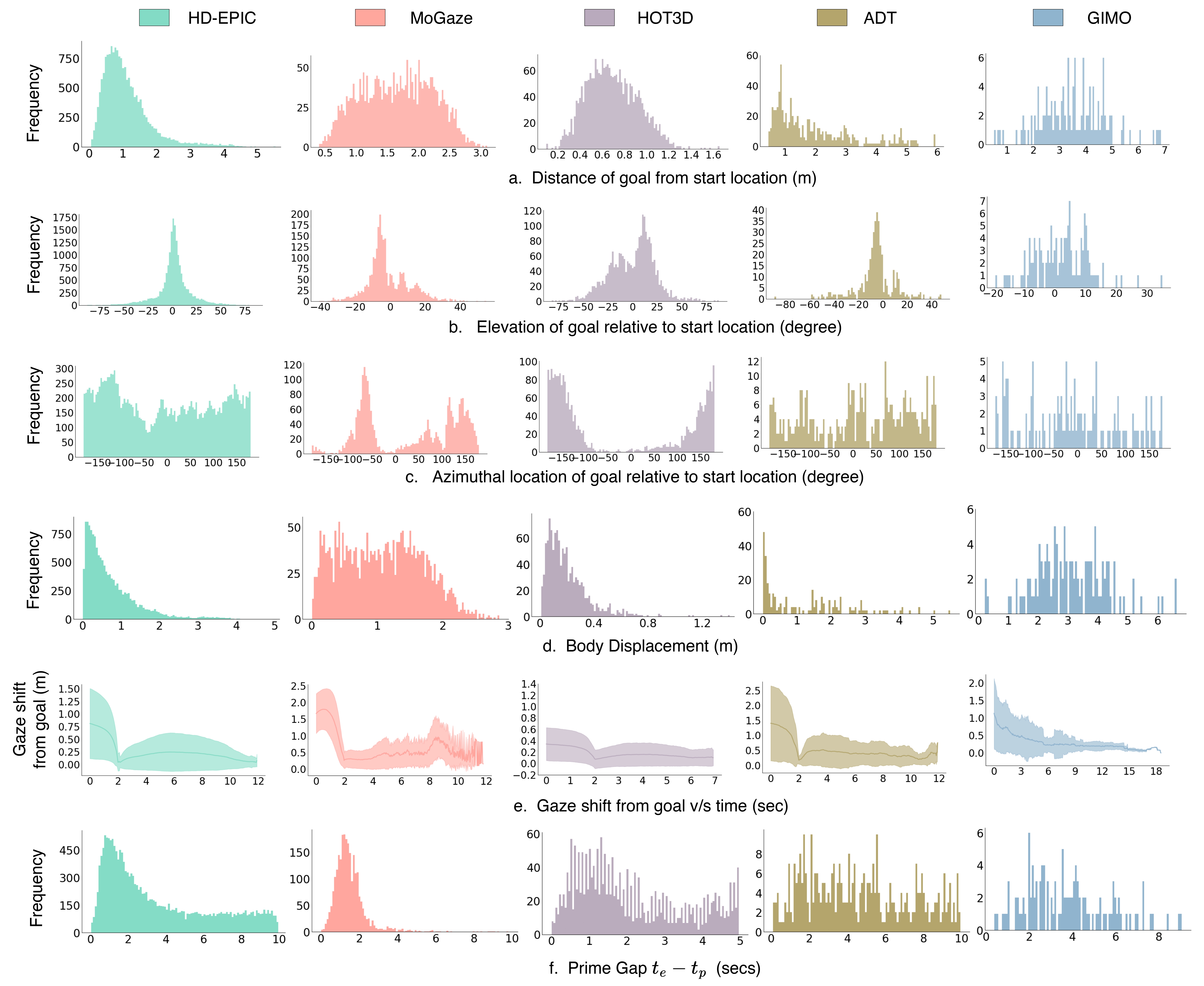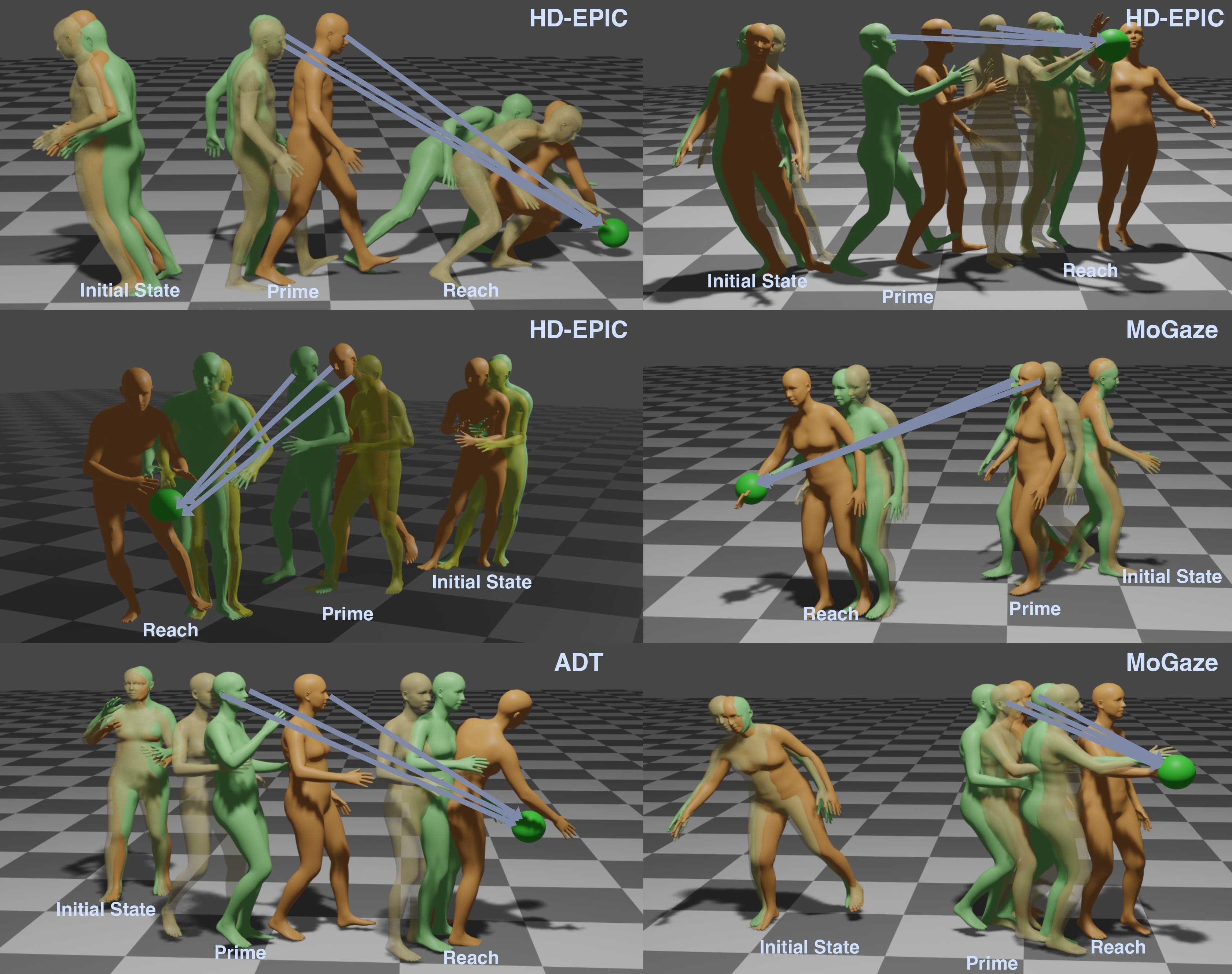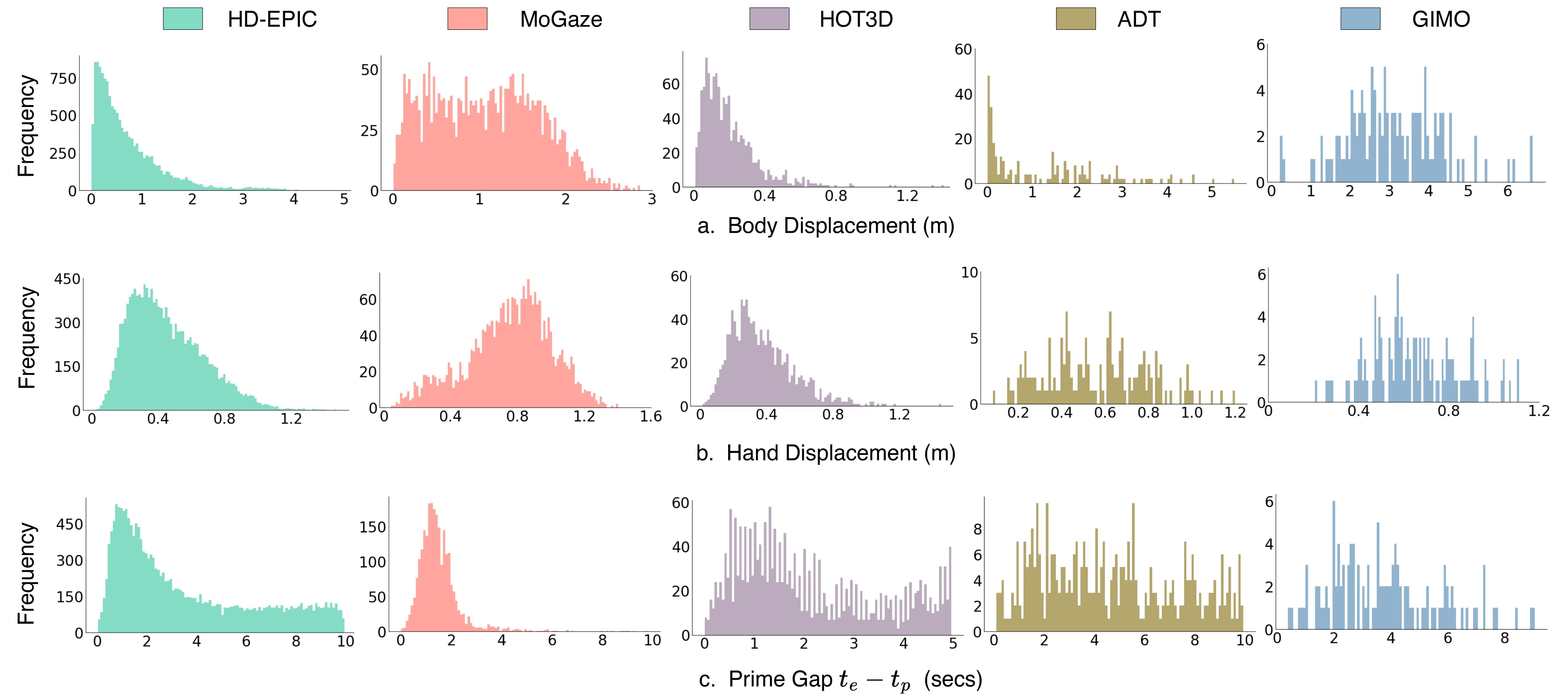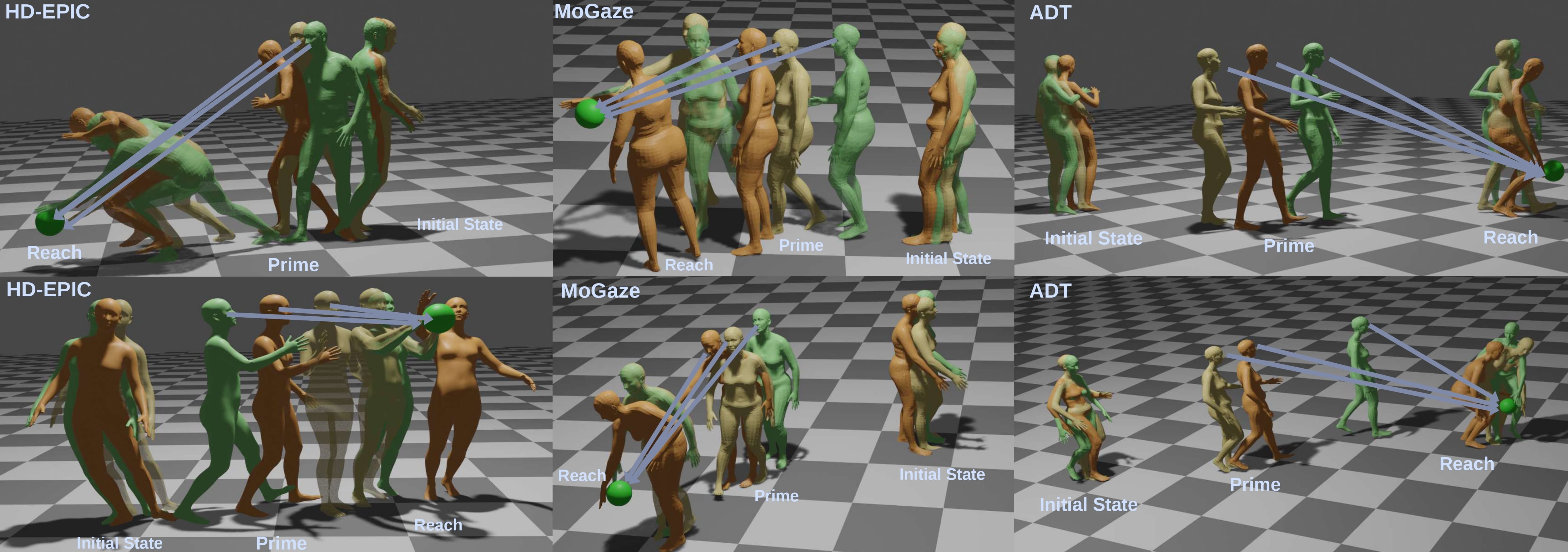 A critical aspect largely unexplored is the role of gaze in priming or ‘spotting’ objects prior to the reaching motion. We take this missed opportunity and curate for the first time prime and reach motion sequences. In total, we curate 23,728 prime and reach sequences from five datasets namely HD-EPIC, MoGaze, HOT3D, ADT and GIMO. We showcase sample prime and reach sequences and data statistics below.